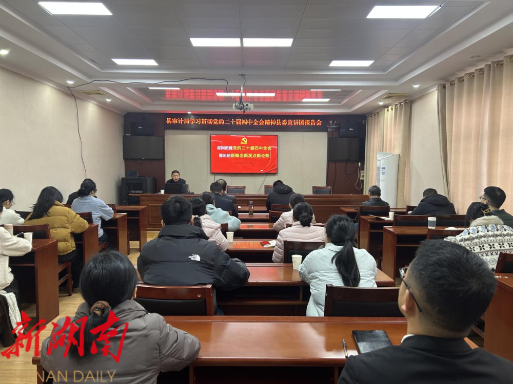 湖南日报·新湖南客户端12月22日讯(通讯员 张小军) 为深入学习贯彻党的二十届四中全会精神,根据县委统一部署,12月22日,县审计局举办学习贯彻党的二十届四中全会精神宣讲报告会,会议邀请了县委宣讲团成员、县直工委常务副书记吴拥民作专题辅导报告,全体干部职工参会。