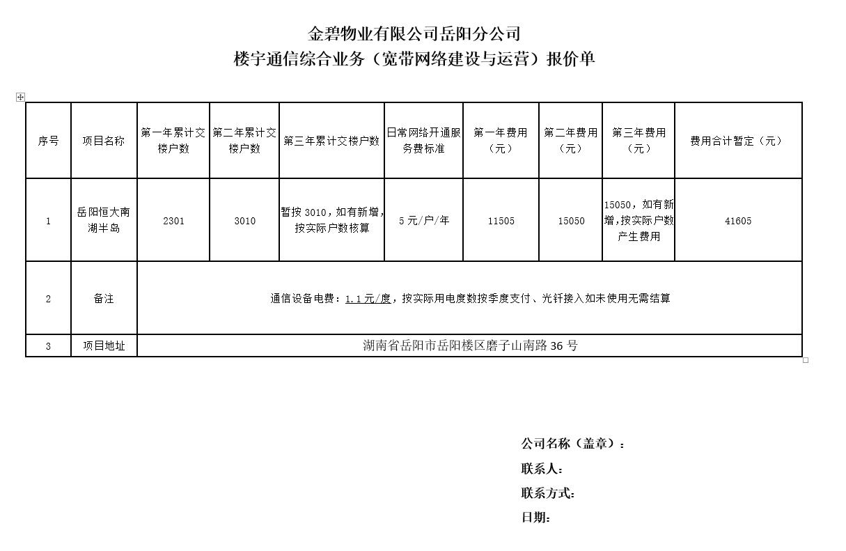 附:金碧物业有限公司岳阳分公司楼宇通信综合业务(宽带网络建设与运营)报价单
