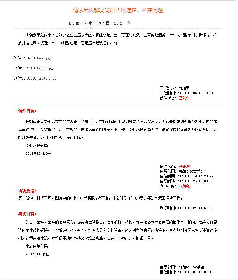经查,举报人举报的情况属实,该违法建设是现浇灌注的框架结构,并已镶嵌到主体房屋的墙体中,拆除难度较大且易造成主体结构受损,上次拆除行动未有专业拆除人员和专业设备,避免对主体房屋造成损伤,南湖规划分局已将此违法建设列入存量违法建筑,并督促属地办事处及区综合执法大队进行方案研究,抓紧处置。