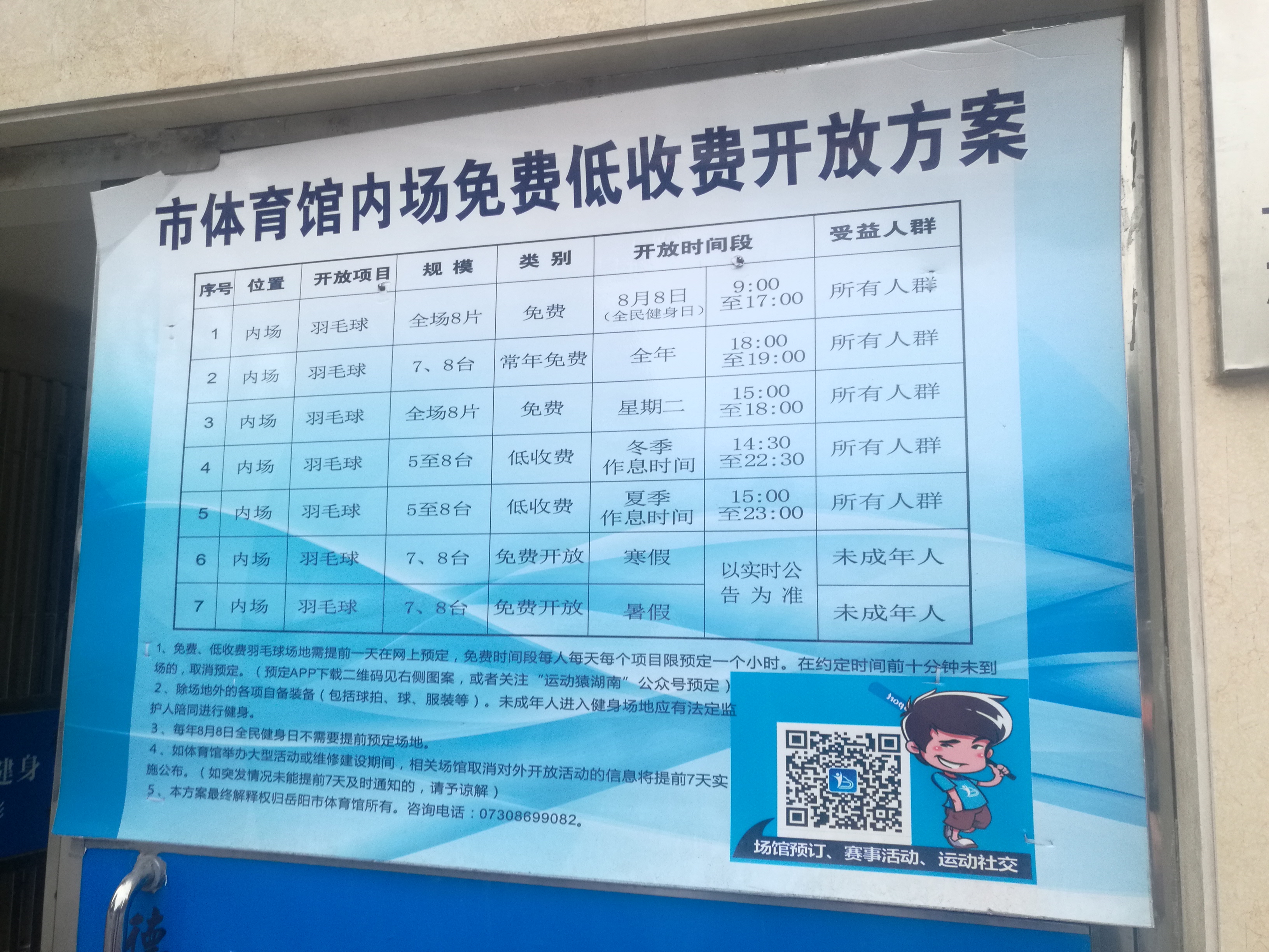 岳阳市体育馆外张贴了一张针对内场羽毛球场的“免费低收费开放方案”,上面写的是7、8台常年18:00-19:00免费,5-8台常年低收费,并且还有场馆预定的二维码,扫码显示进行预定场地操作。但内场又张贴了一张收费标准,上面写的又是每个场地都是收费的,分时段不同,电话咨询也答复说没有免费场地,并且不接受预订。
