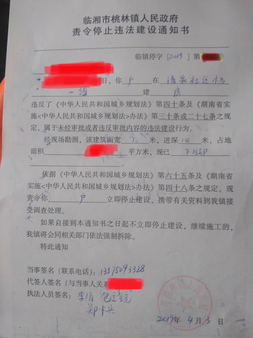 4、根据《中华人民共和国城乡规划法》第六十五条之规定:在乡、村庄规划区内未依法取得乡村建设规划许可证或者未按照乡村建设规划许可证的规定进行建设的,由乡、镇人民政府责令停止建设、限期改正;逾期不改正的,可以拆除。所以附件中以桃林镇政府出具的“责令停止违法建设通知书”具有法律效力。签字人是我镇规划建设环保站以劳务派遣形式聘用的工作人员。