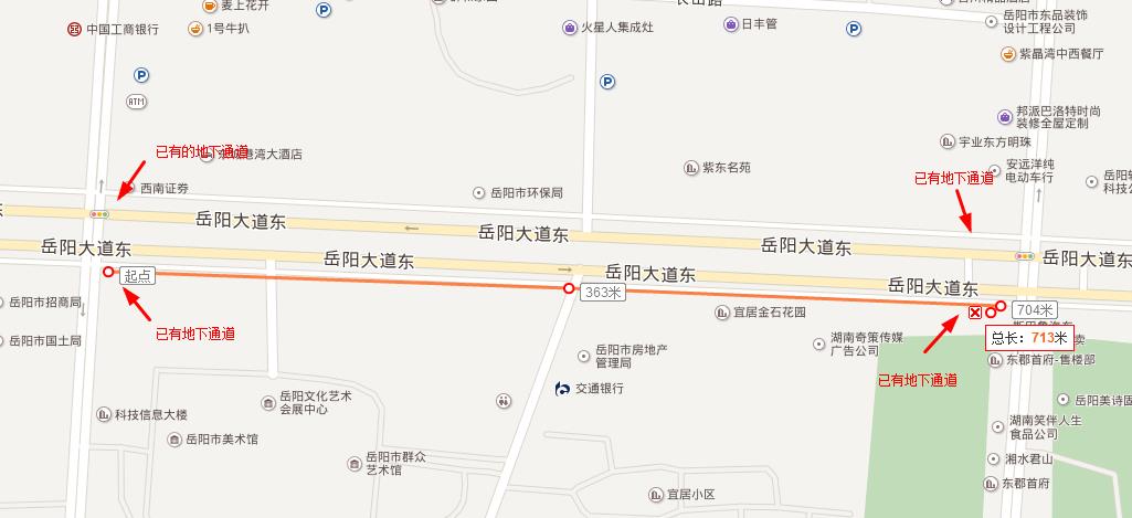 如附件图片标明岳阳大道东会展中心前一地下通道至会展中心后下一地下通道距离有700余米,可中间却没有通道过去对面,中间离左右两通道差不多各距离有300余米,而恰好街道中心处两端各有岔道通往房产局、新检察院、居民区,导致不时有行人为了方便冒险从中间绿化带走过了,不然想走到对面得绕行走地下通道差不多8,900余米,且绿化带已走出一条通道,所以希望有关部门能考虑是否增加地下通道或天桥。
