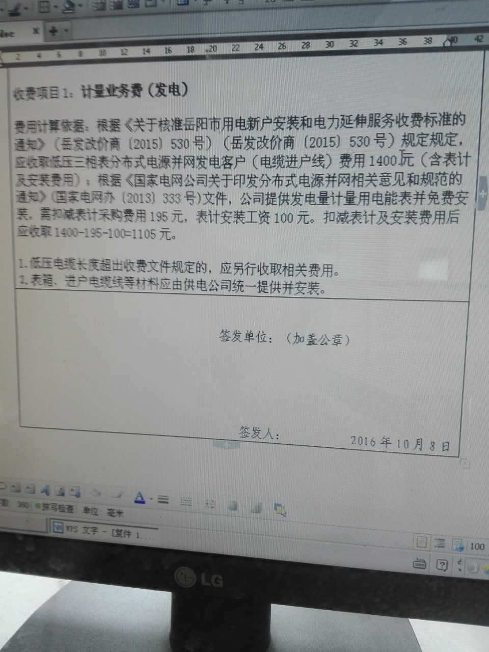 您好!我客户是湖南省汨罗市居民,有自建房一栋且已有合法产权,考虑在自家屋顶安装一个5KW并网光伏电站。既响应国家能源发展十三五规划的要求,也在地方上为绿色环保起到模范带头作用。日前在汨罗市电力局(位于汨新大道湖南省电力公司岳阳汨罗电力局)办理光伏发电申请时,工作人员受理申请后,被告知要求支付1105元费用,附件是电力局出具的收费依据。