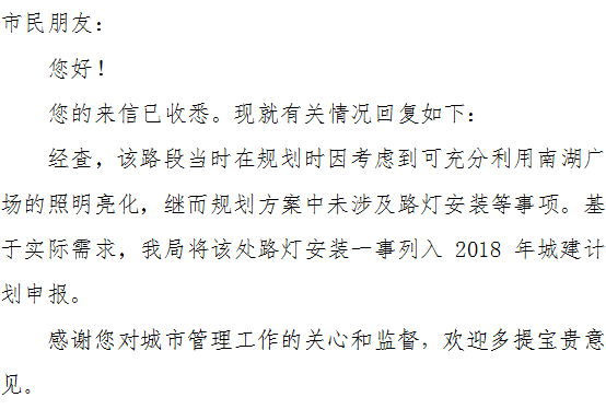 南湖广场于1999年修建,当时在龙舟路的东边修建了一排圆柱形的路灯,大概两年后不知什么原因拆除后,一直没有安装路灯。岳州帝院修建后,其西边一带安装了路灯,唯独财政局至南湖游路一段龙舟路(约200米)长年没有安装路灯。此段居民、行人、车辆密集,由于没有路灯照明,不仅给行人和车辆带来不便,而且存在着很大的安全隐患,也出现过一些安全事故。许多群众对此很是不满。为此,请求市政府尽快在龙舟路安装路灯。