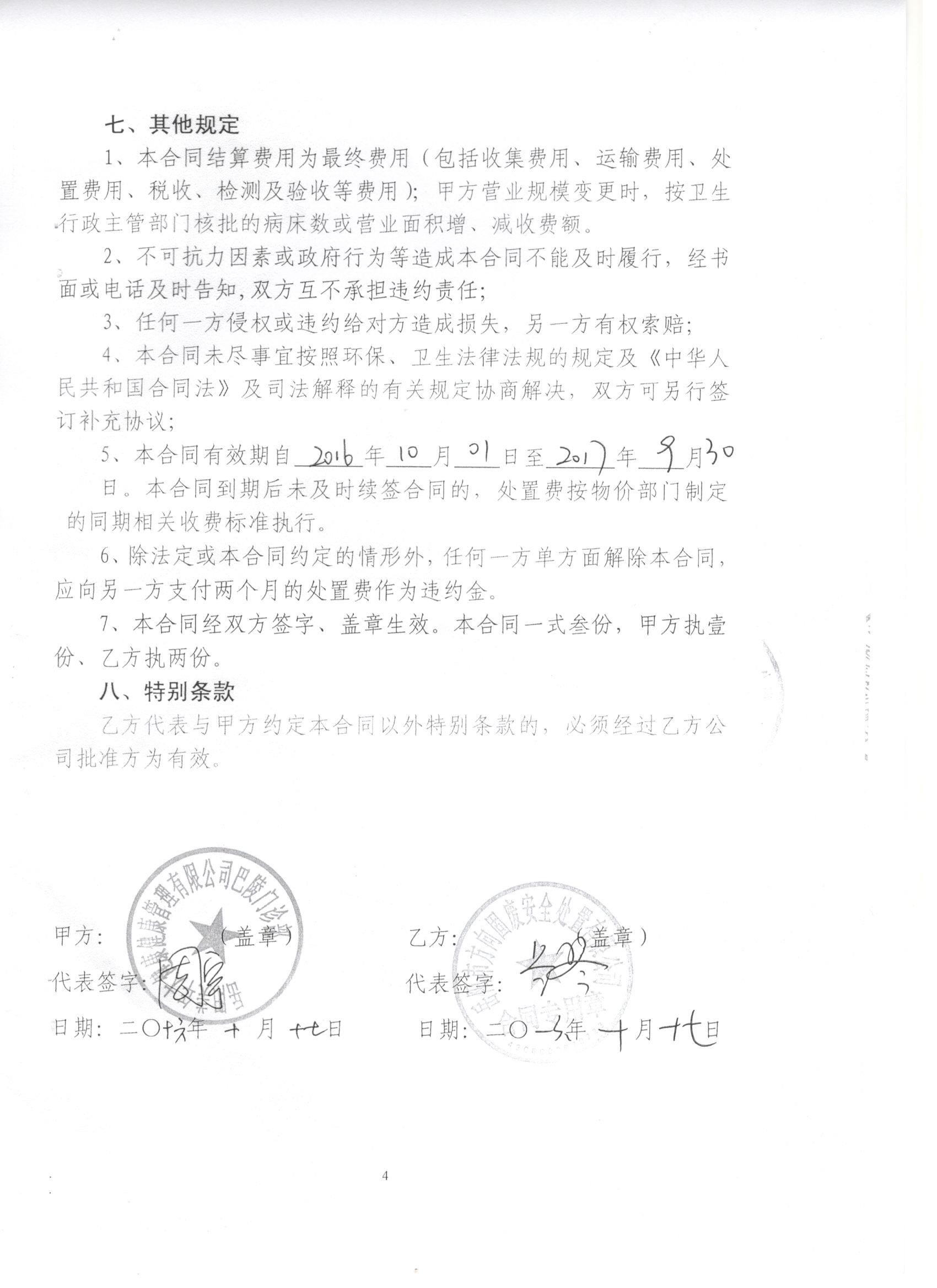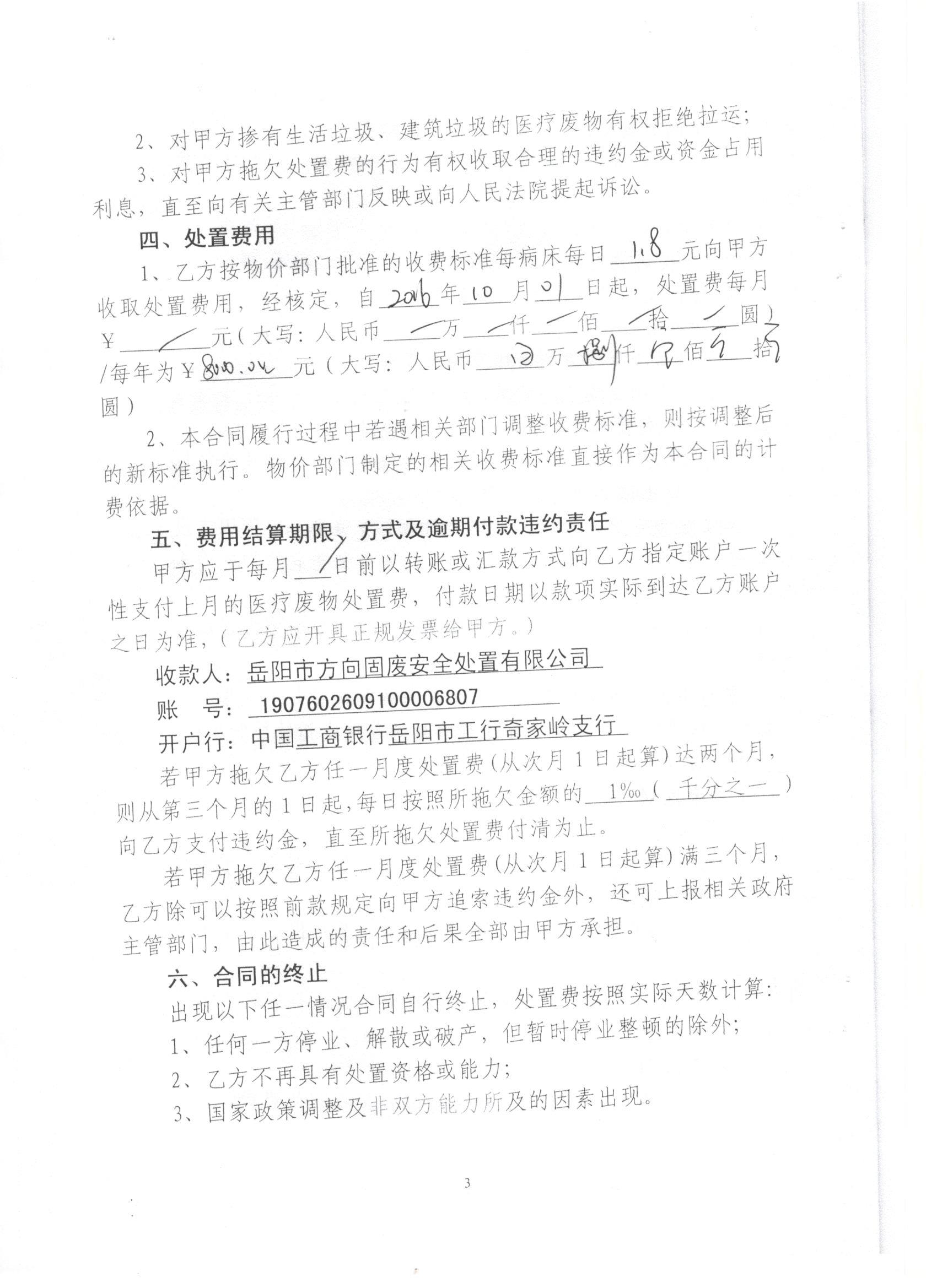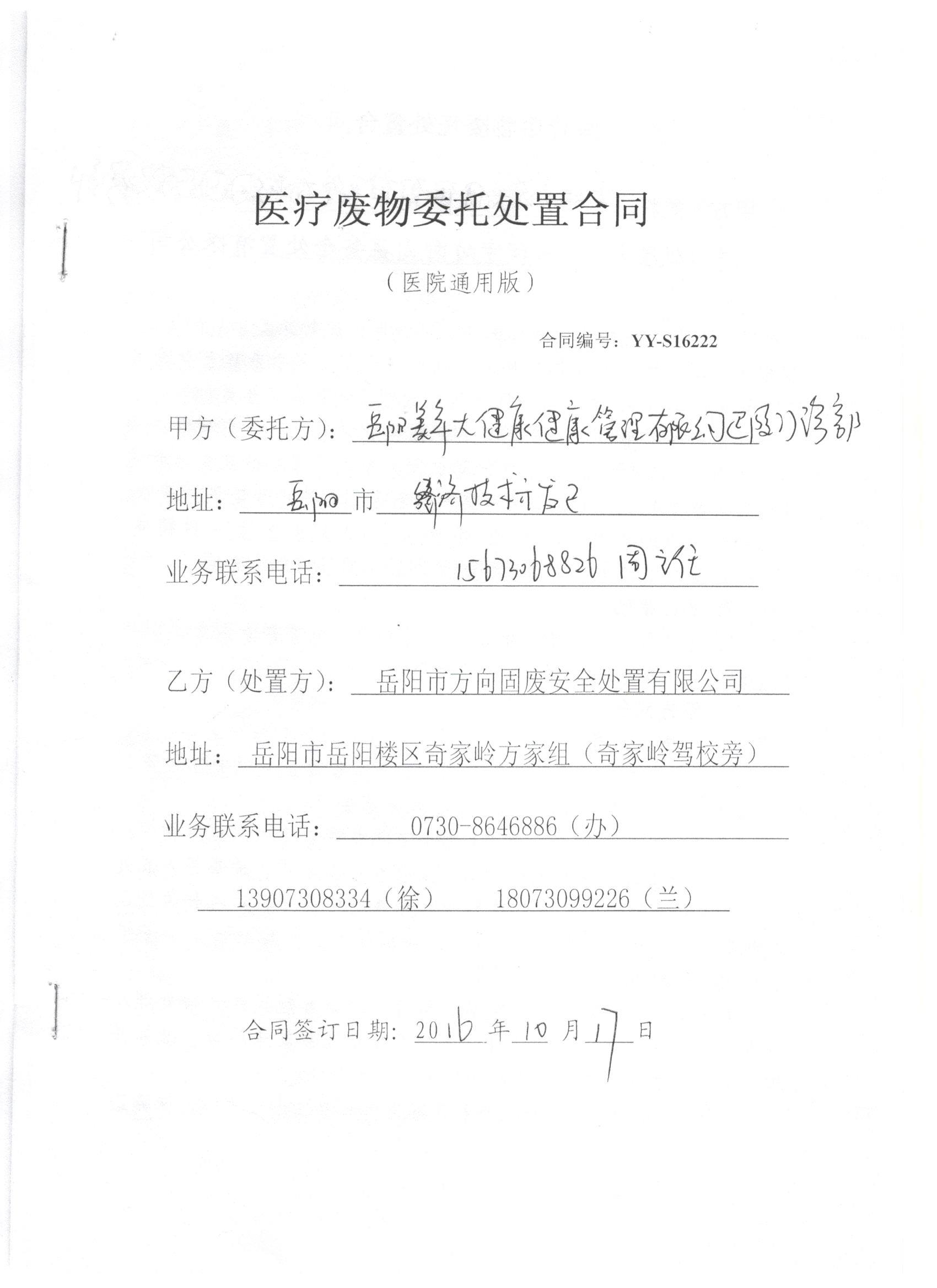 我司于2016年10月17日与岳阳市方向固废安全处置有限公司(以下简称“方向固废”)签订了《医疗废物委托处置合同》,有效期至2017年9月30日,合同价格为8000元。
