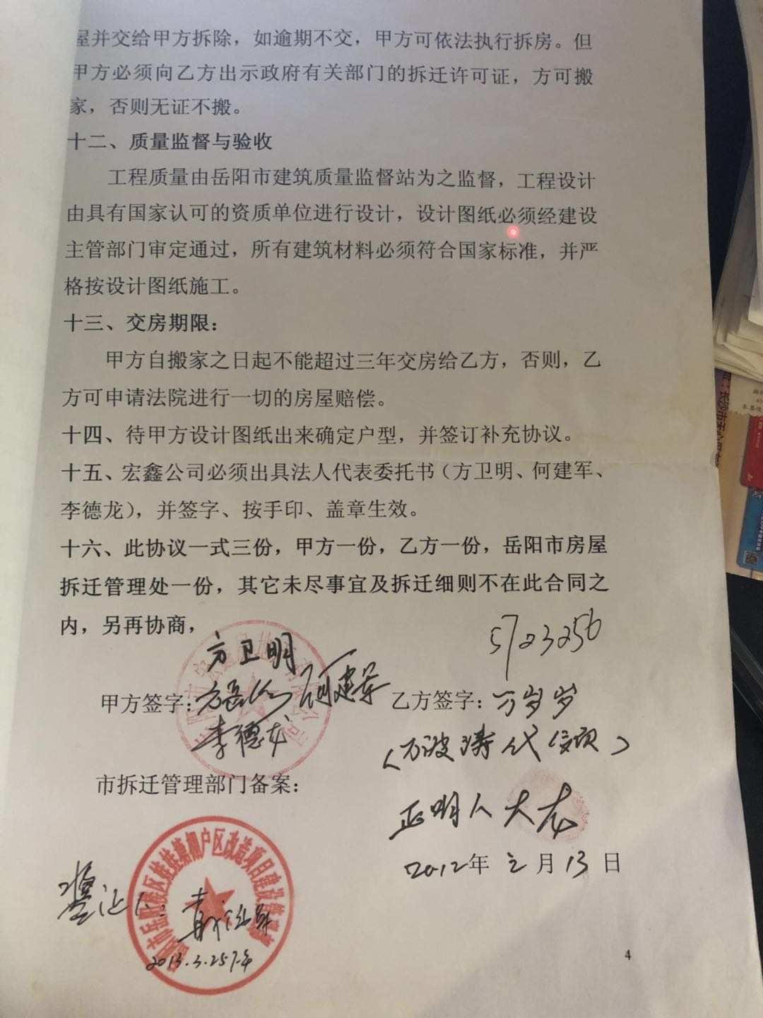 你们好!我是原岳阳市楼区东井岭小区六层楼业主,在2012年11月15日,岳阳市楼区征收安置工作局对我们下发了棚户区改造通知。由岳阳宏鑫房地产有限公司进行拆迁改造,并签订了拆旧还建合同。