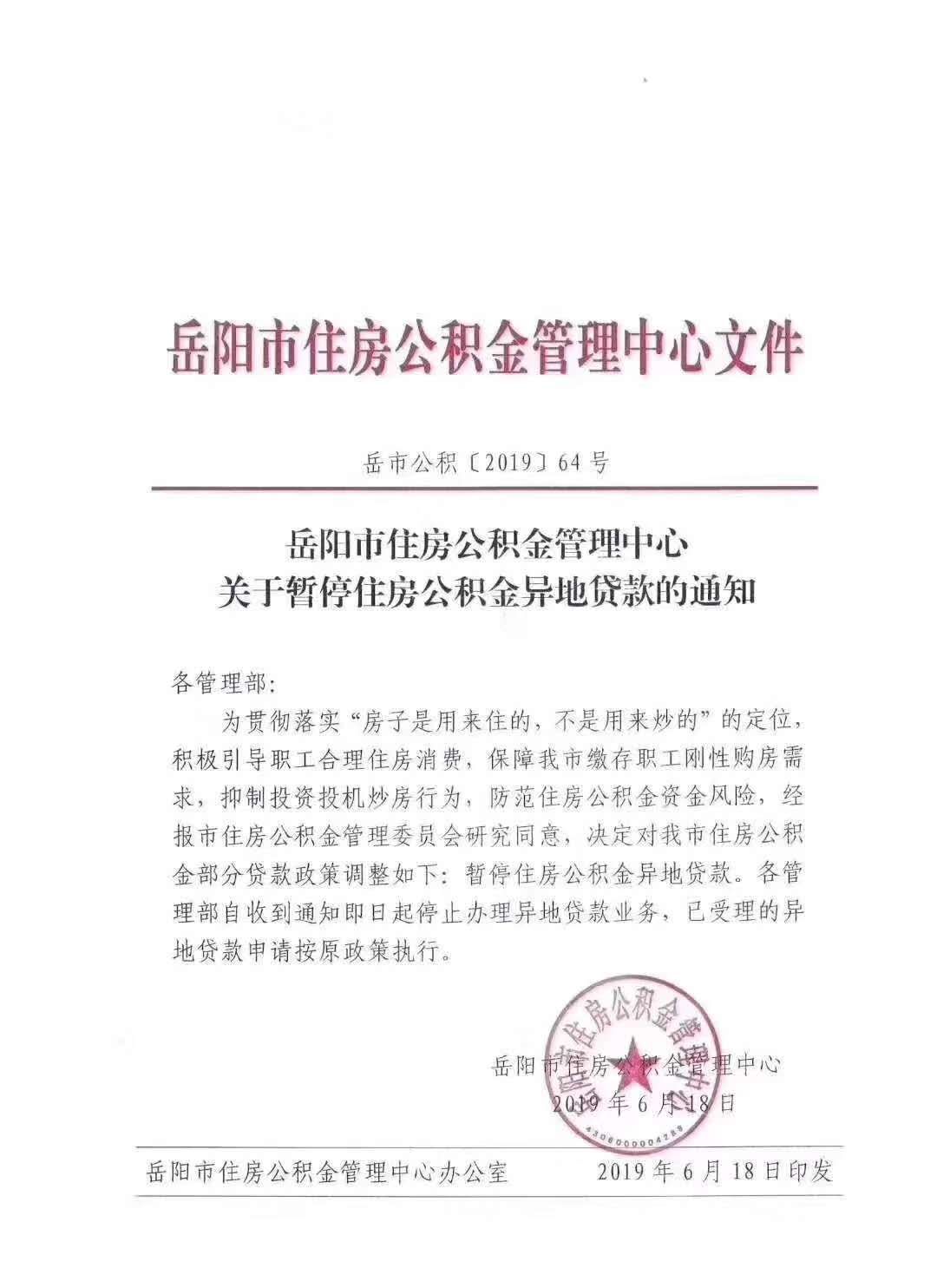 | 回复内容: | 您好!感谢您对住房公积金的关心与关注! 就您对住房公积金政策的相关建议现予回复:根据《岳阳市住房公积金管理委员会关于调整部分贷款政策的通知》(岳住委【2019】7号)文件规定:经市住房公积金管理委员会研究同意,决定对我市住房公积金部分贷款政策调整如下:暂停我市住房公积金异地贷款。此文件于2019年6月18日执行。 |