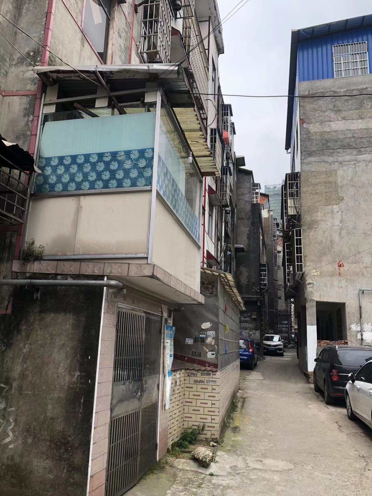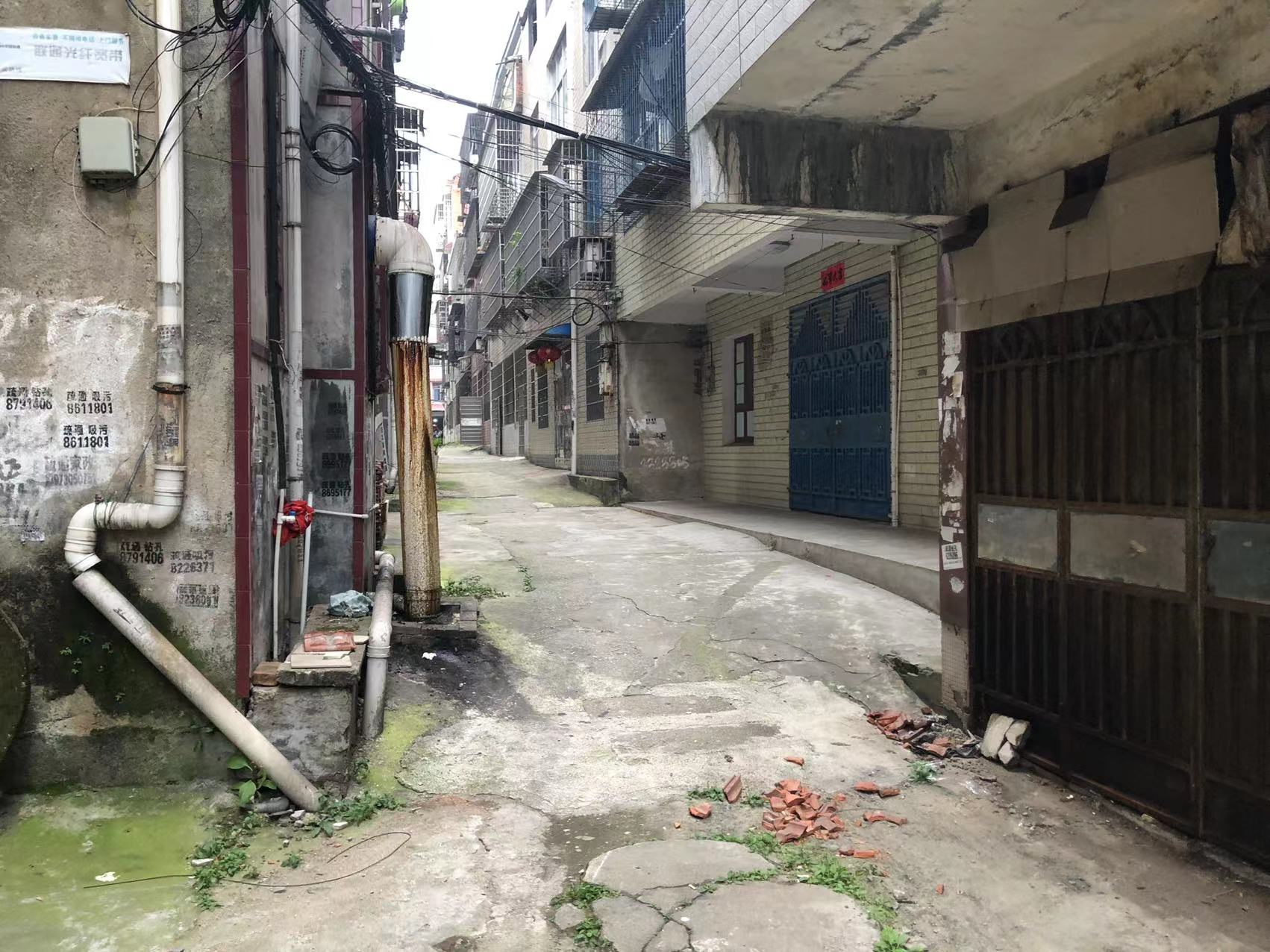 这边都是二十多年的私房,原本地基规划就是参差不齐,五排房子没有一条巷子是直的,原本三米多宽的通道还被各种违章建筑占用,有的水表井盖高出地面二三十厘米,有的直接在屋前搭棚,把通道占用得只剩两米多宽。